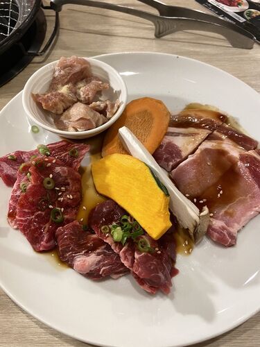 少し前に行って美味しいしお得だったので、再訪。 土日なのに、店内はガラガラ。穴場は健在だ。 小員は今回、ランチメニューからレディースセット¥1,408円をオーダー。 鶏、豚、牛、ソーセージの盛り合わせと、味噌汁にご飯。 ご飯のお代わりは自由らしいが…